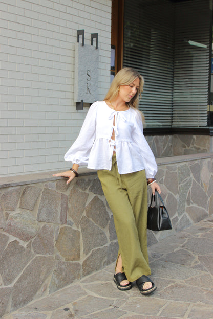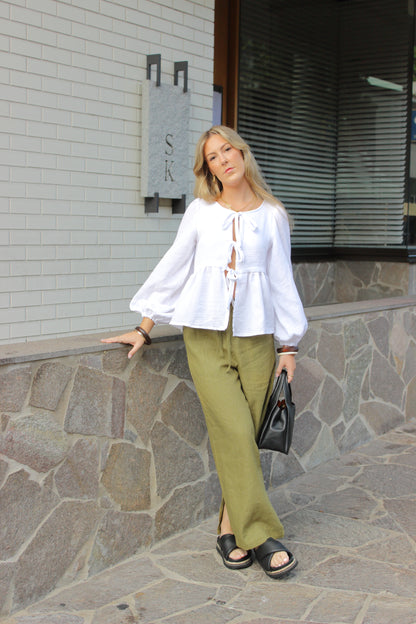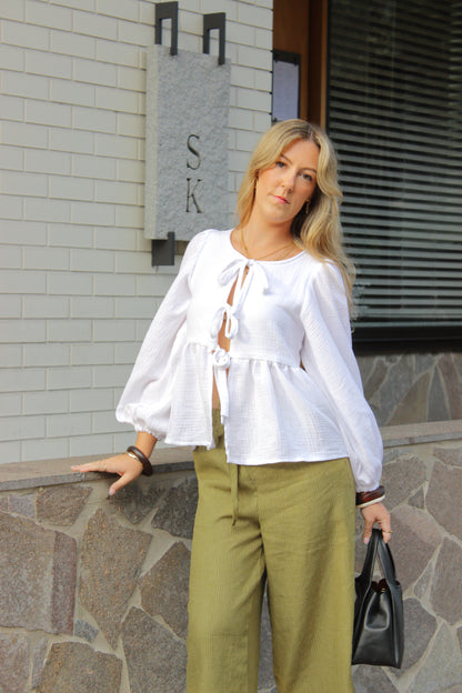Cosy up this winter in our Amara Blouse! Made from our signature organic cotton double gauze that we know and love for its breathability and softness. The top features a gorgeous flowy silhouette, front ties to close, long puffy sleeves and a gorgeous lower frill, making it stand out for an everyday piece. A fun little bonus is that this top was designed to be worn both ways, making it versatile for all occasions!