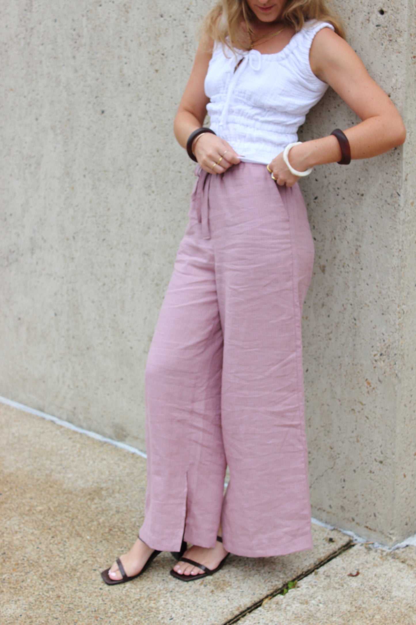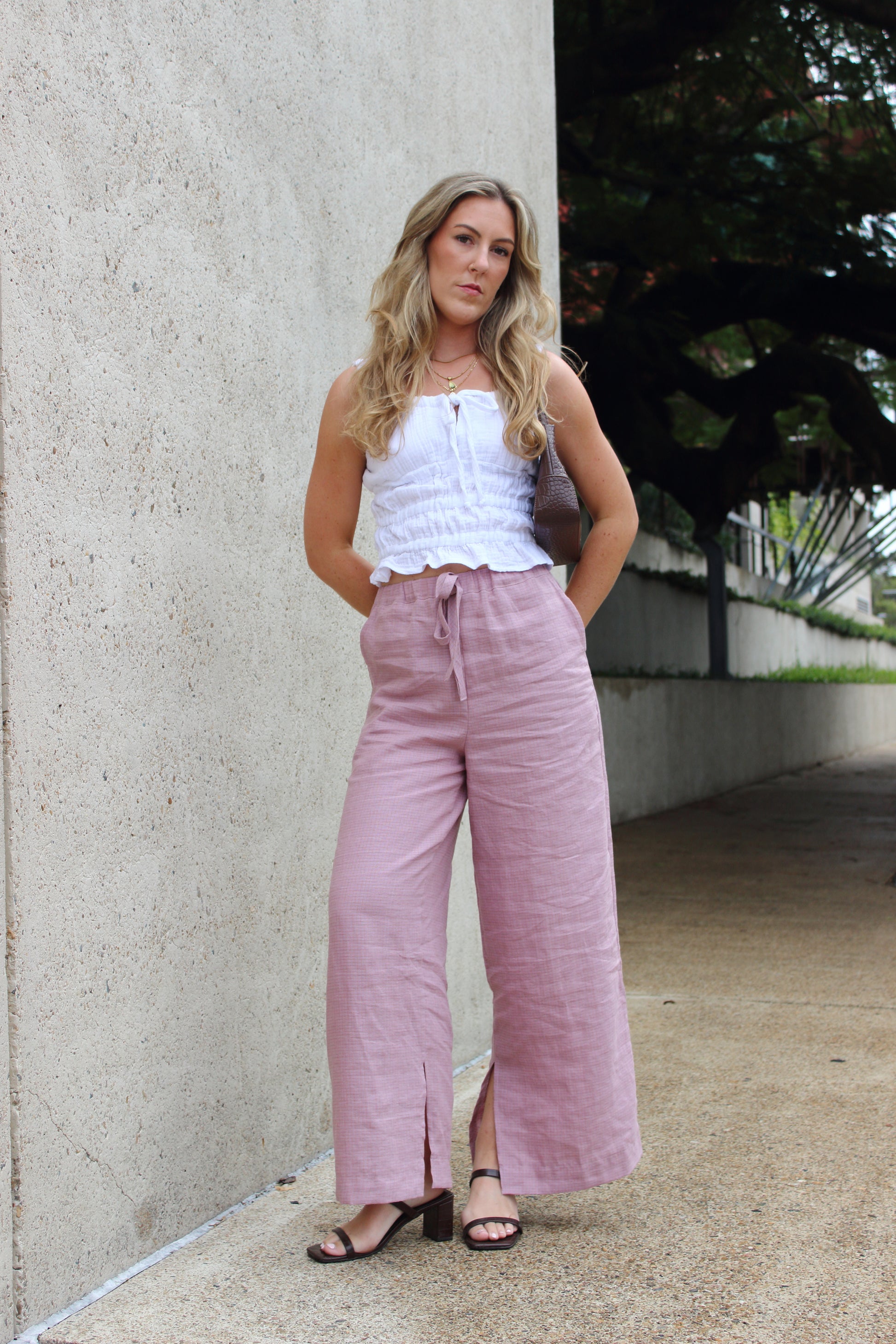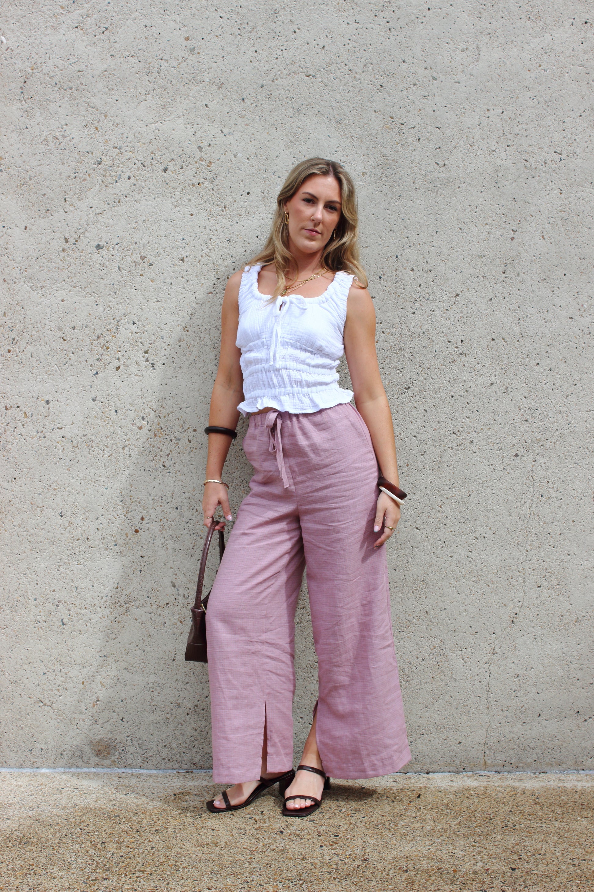 Feeling comfortable is easy with our Charlie Pants! An everyday classic shape, these pants are your new go-to when you 're after a pop of colour. Featuring a high waisted fit with an elastic waistband and faux drawstring, angled pockets, long sliming legs and a split at the end of the inside seam. These pants play on timeless designs while encapsulating inspiring shapes and structures, making it a perfect piece for your wardrobe!