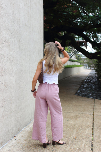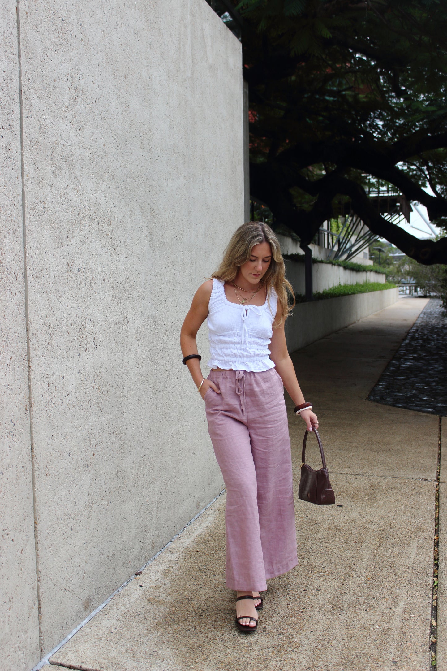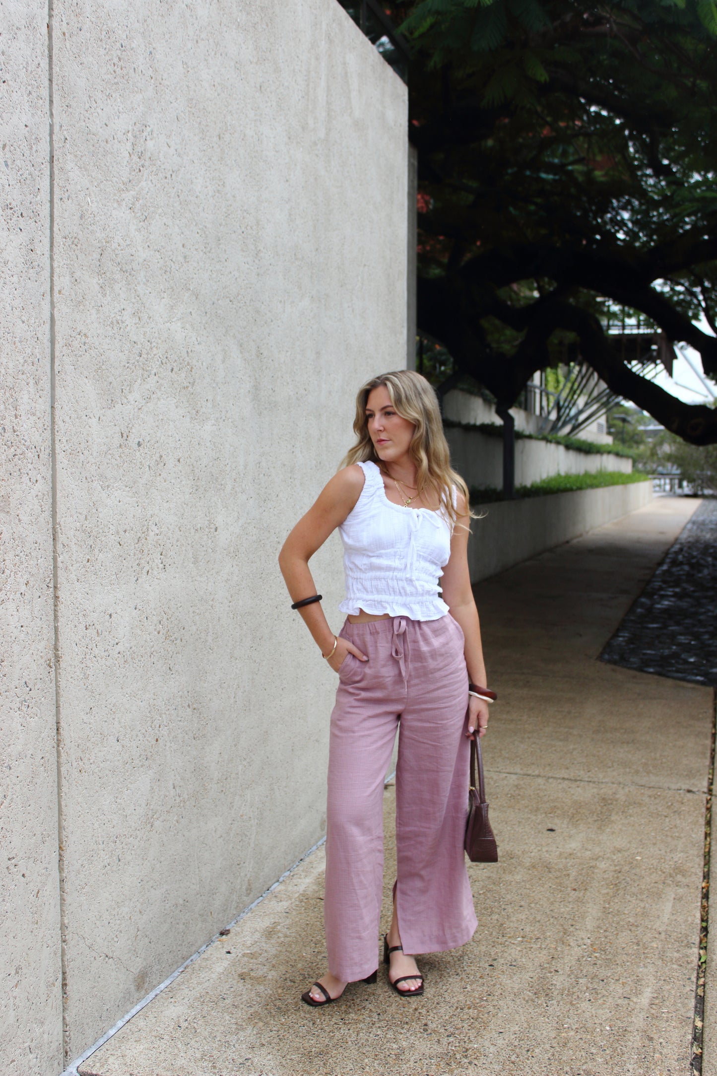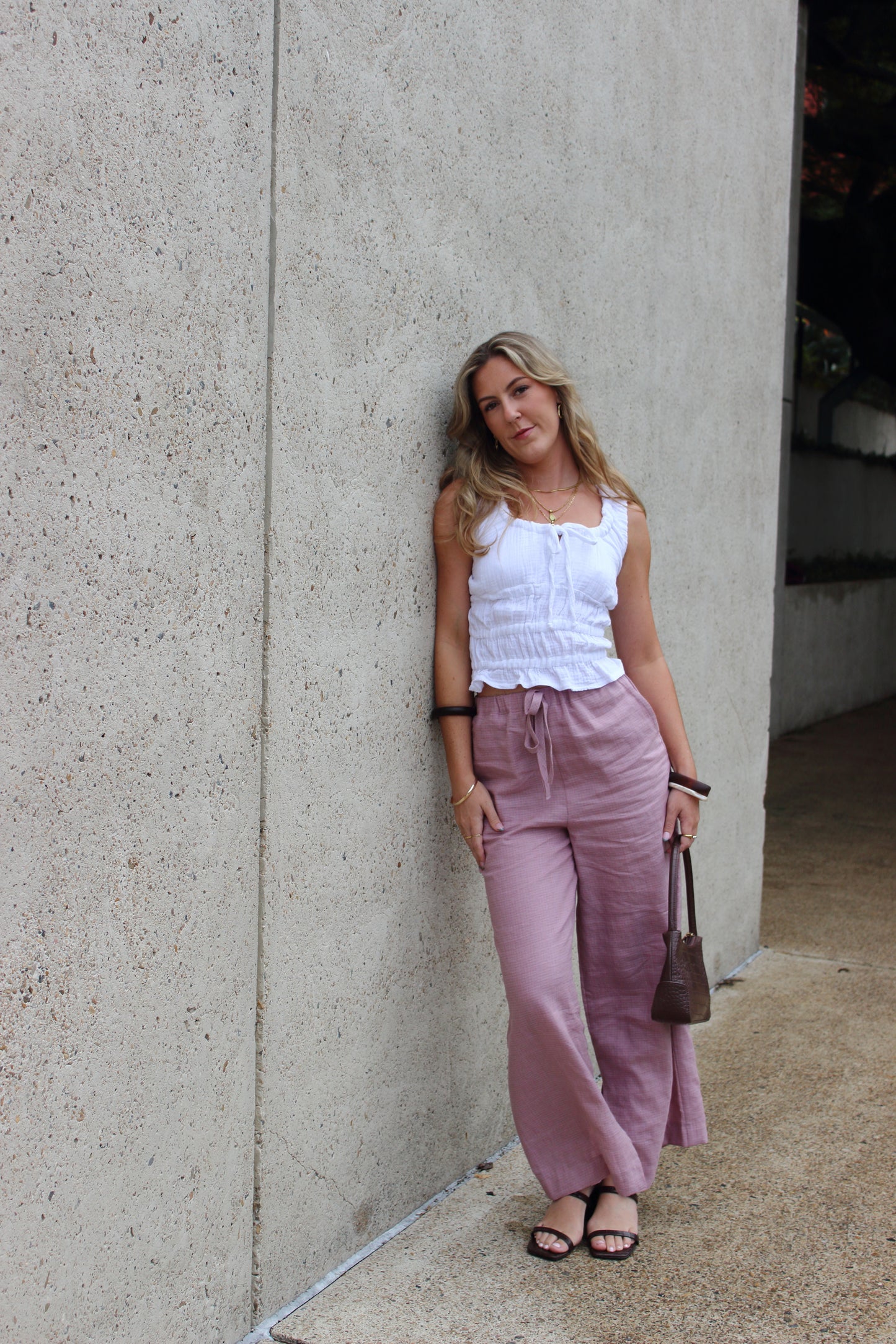 Feeling comfortable is easy with our Charlie Pants! An everyday classic shape, these pants are your new go-to when you 're after a pop of colour. Featuring a high waisted fit with an elastic waistband and faux drawstring, angled pockets, long sliming legs and a split at the end of the inside seam. These pants play on timeless designs while encapsulating inspiring shapes and structures, making it a perfect piece for your wardrobe!