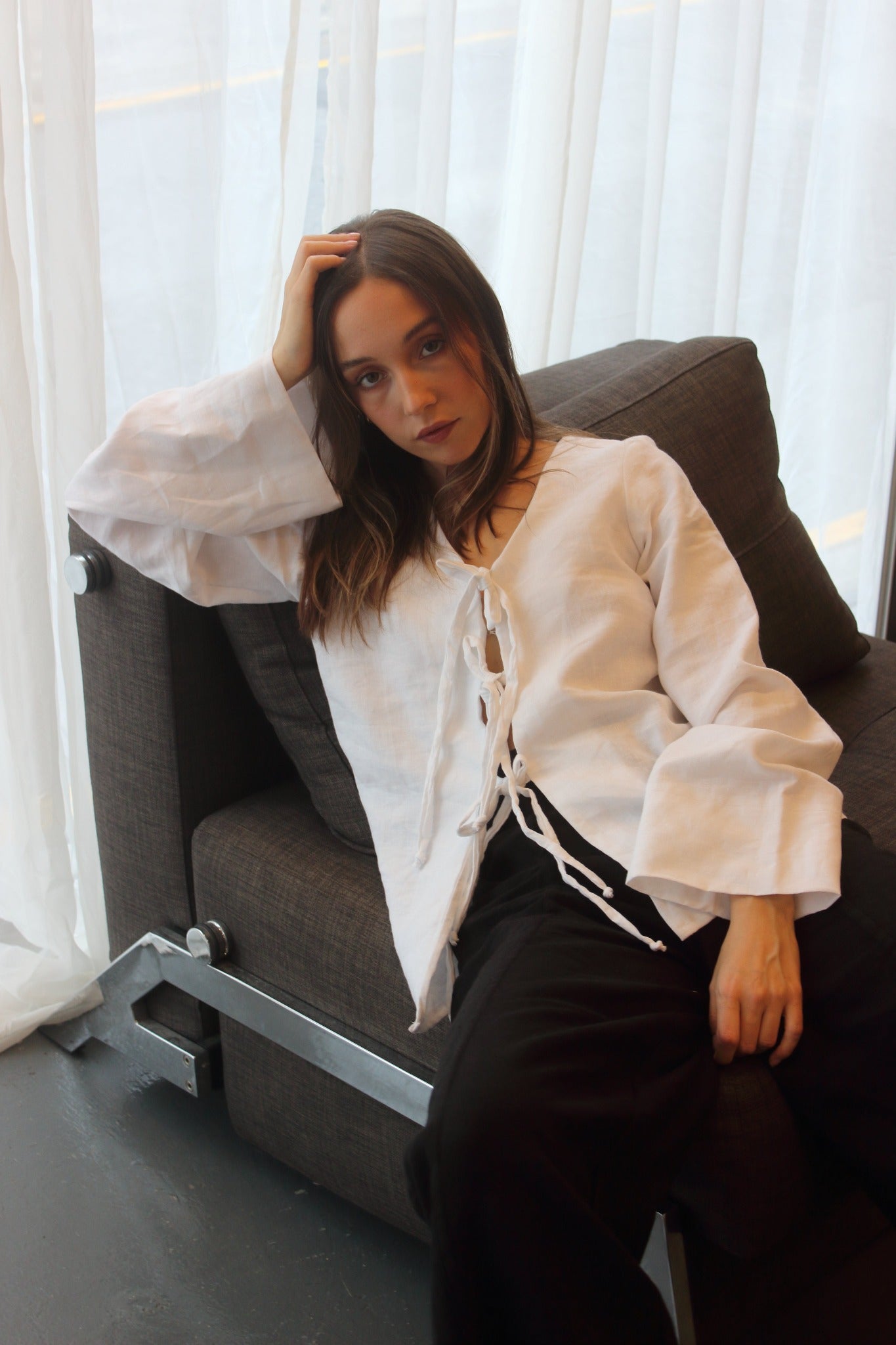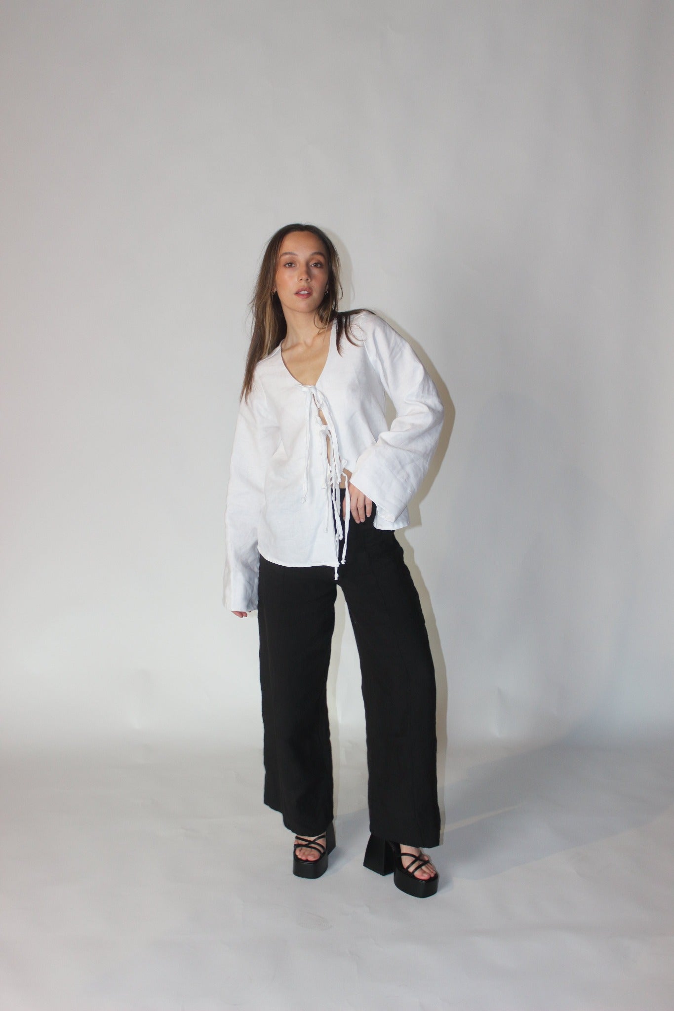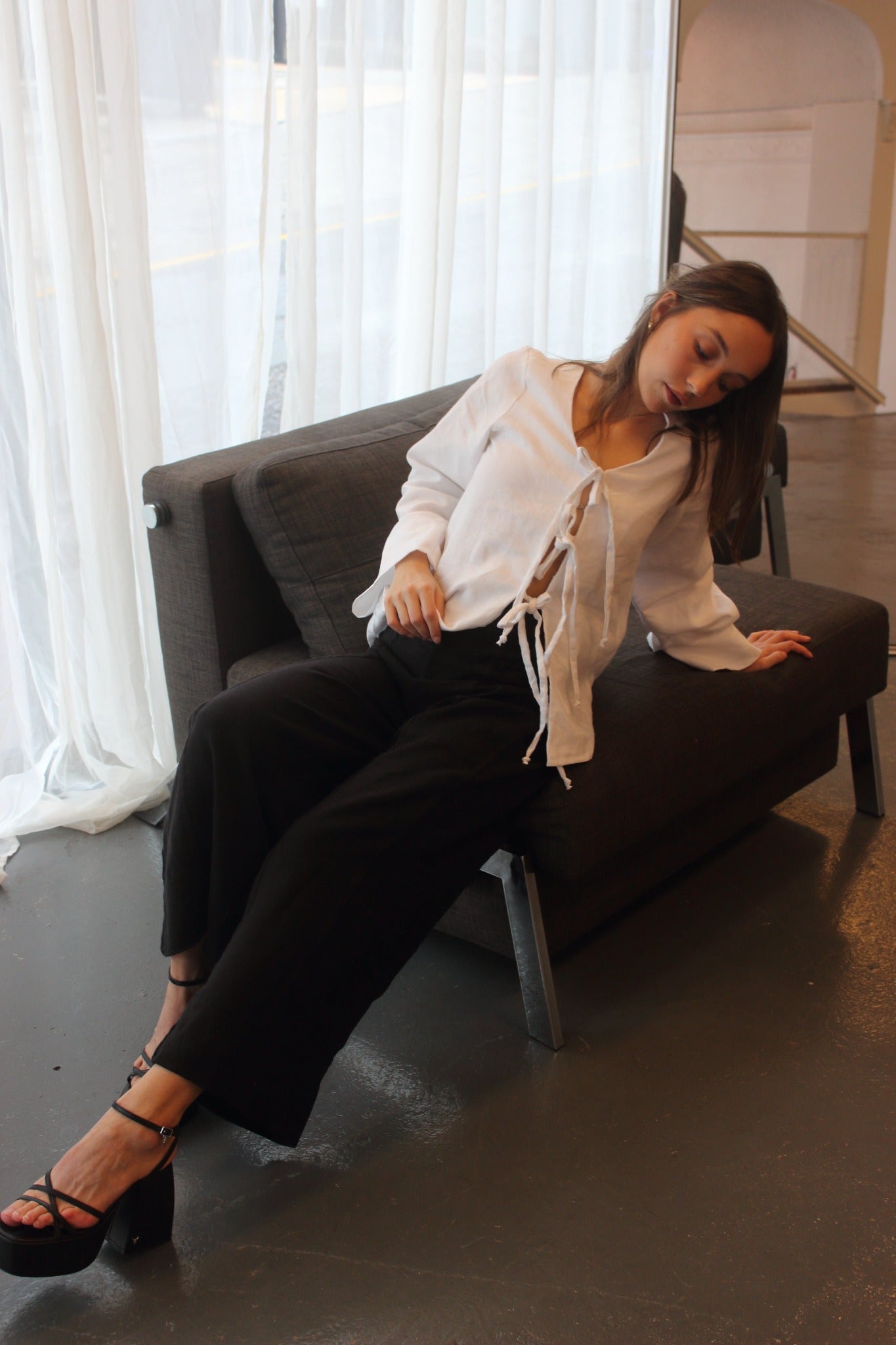 Meet the Lily Blouse - your new go-to long sleeved bestie for the cooler months. This piece features a gorgeous neckline with bow detailing to close as well as hook and eye clasps between for extra security. With slim fit sleeves that open into a wide 4" hem and a nice curve at the waist, this top is flirty and elegant all in one. Pair with your favourite denim or match with the Paloma pants for a sophisticated look!