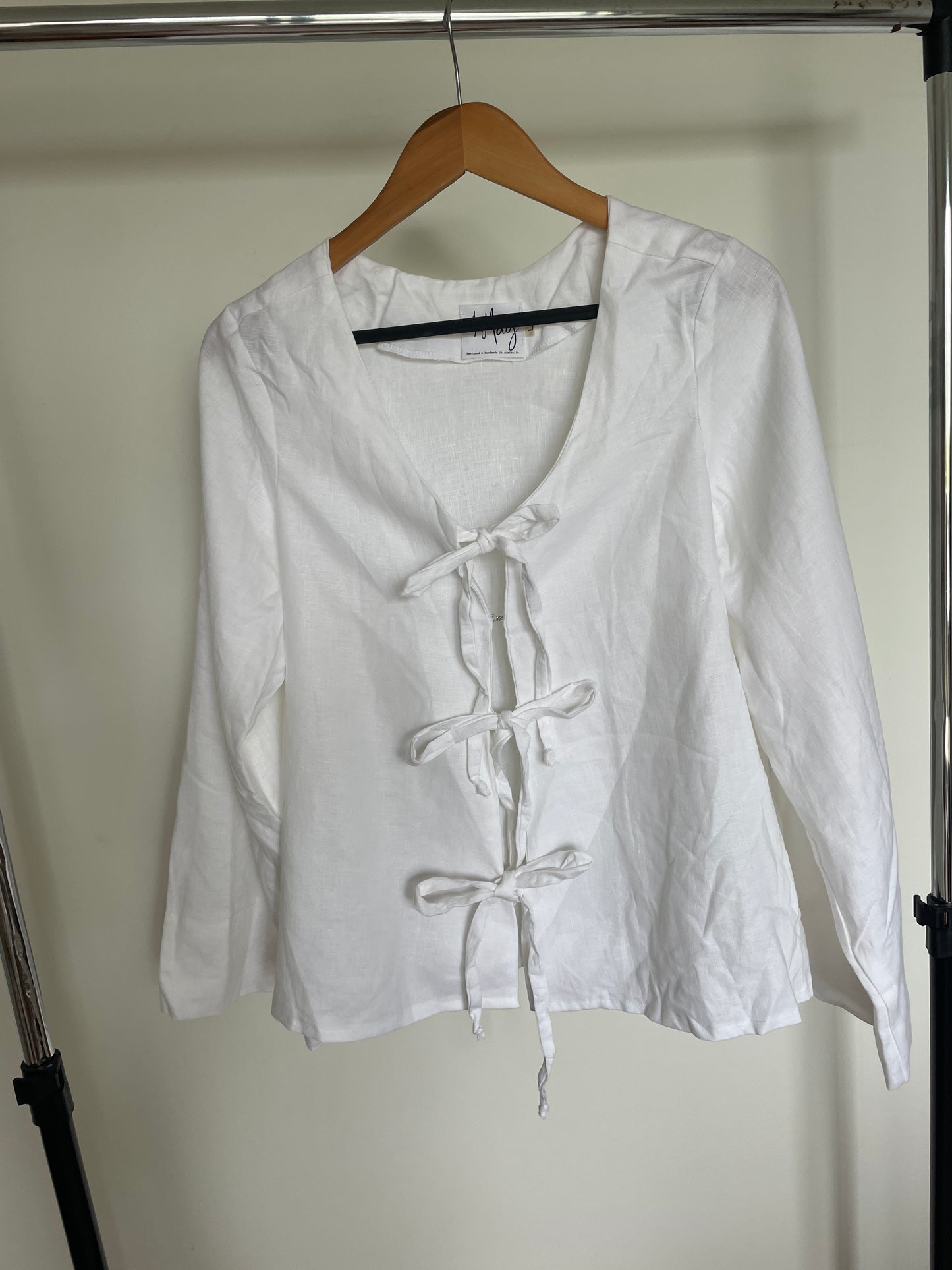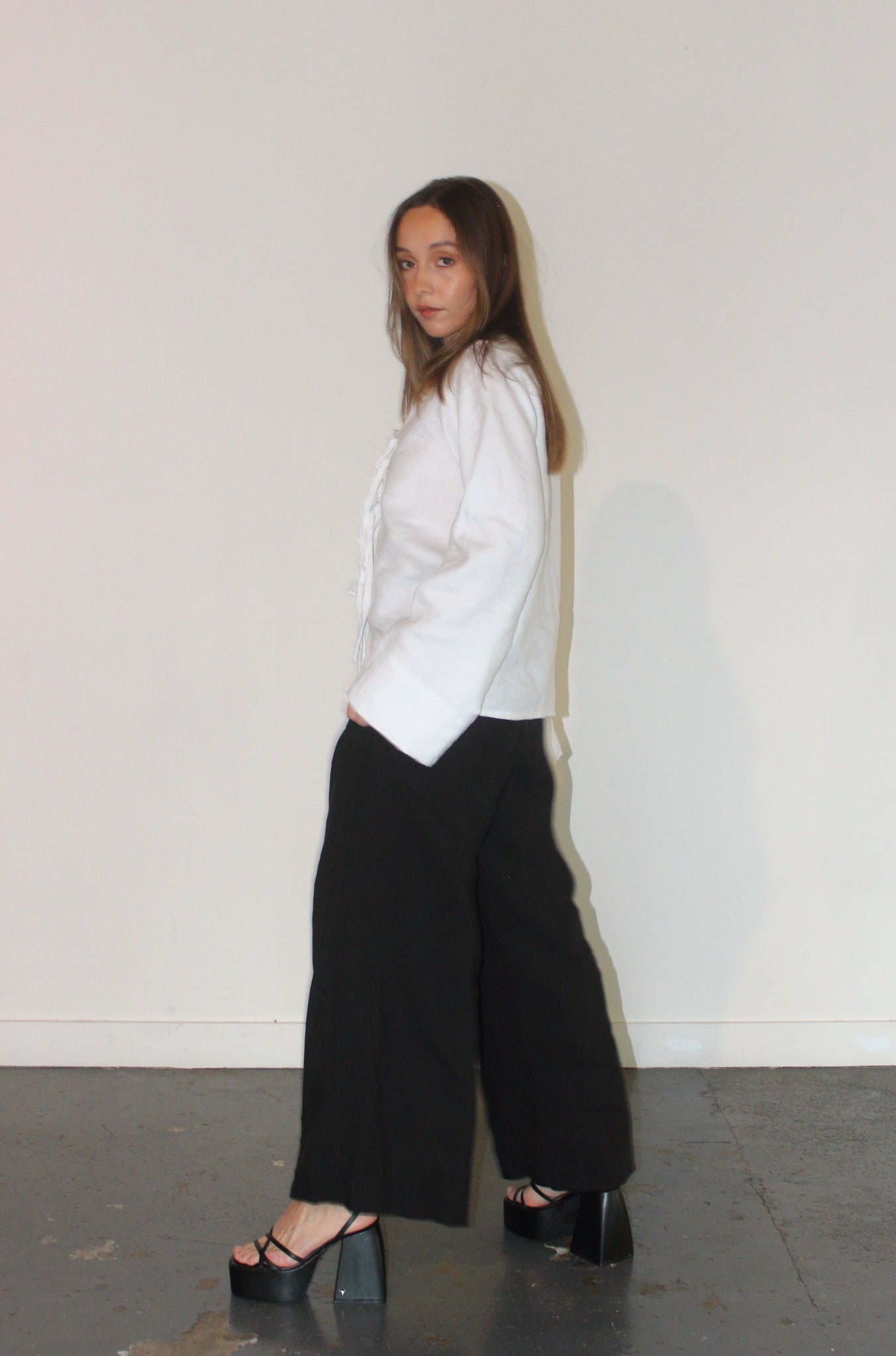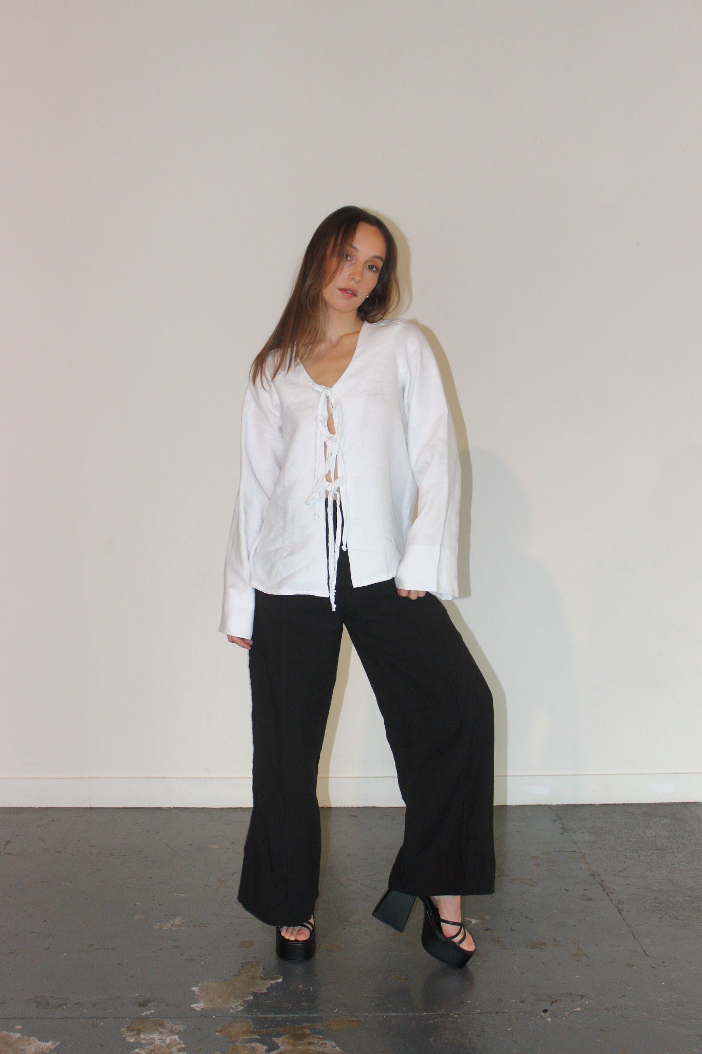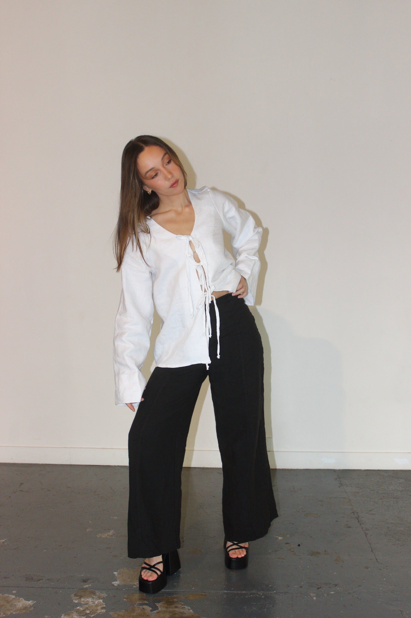 Meet the Lily Blouse - your new go-to long sleeved bestie for the cooler months. This piece features a gorgeous neckline with bow detailing to close as well as hook and eye clasps between for extra security. With slim fit sleeves that open into a wide 4" hem and a nice curve at the waist, this top is flirty and elegant all in one. Pair with your favourite denim or match with the Paloma pants for a sophisticated look!